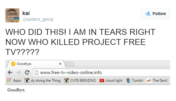 Y su popularidad llegó a ser tan grande (gracias a su servicio fiel y una gran gama de seguidores) que atrajo la atención de algunos titulares por “derechos de autor” –entre ellos estuvo Hollywood, que bloqueo el sitio para el Reino Unido en noviembre de 2013–. Pero todo el drama que ocasiono la popularidad de este sitio de streaming llegó a su fin cuando la página le dijo ‘adiós’ a todos esos años de trabajo arduo. Pocos minutos de que la página haya cambiado su interfaz habitual por el mensaje de despedida, los fanáticos comenzaron a mostrar su descontento por medio de las redes sociales.