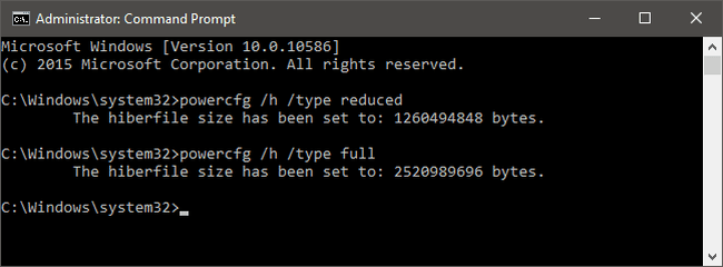 Para hacerlo, debe volver al símbolo del sistema, y utilizar el siguiendo comando: powercfg /h /type reduced. O si desea volver a colocar el tamaño completo debe ingresar el siguiente comando: powercfg /h /type full.